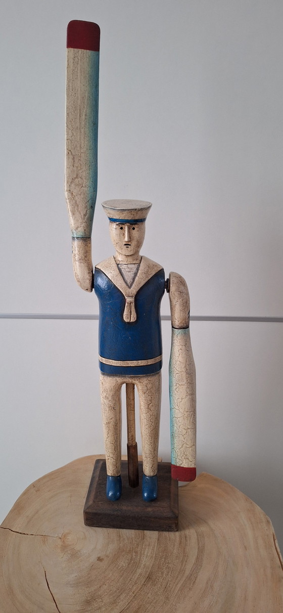 Ontdek de charme van een uniek antiek verzamelobject met deze prachtige oude matroos. Met zijn originele standaard en roeispanen als armen, biedt dit stuk niet alleen visuele aantrekkingskracht maar ook een mechanisch element dat de roeispanen laat draaien.