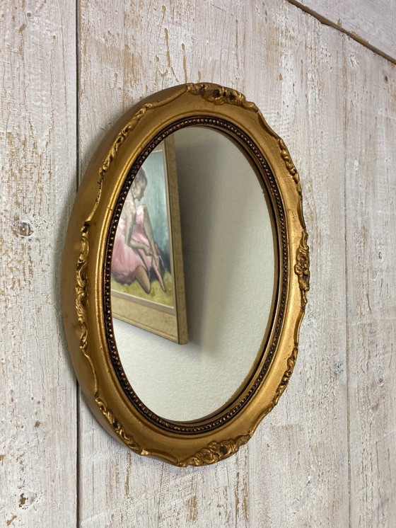 Elegante antieke ovale spiegel met een verguld houten frame. De klassieke en tijdloze vorm past perfect in elk interieur. Ophangmateriaal bevindt zich aan de achterkant.