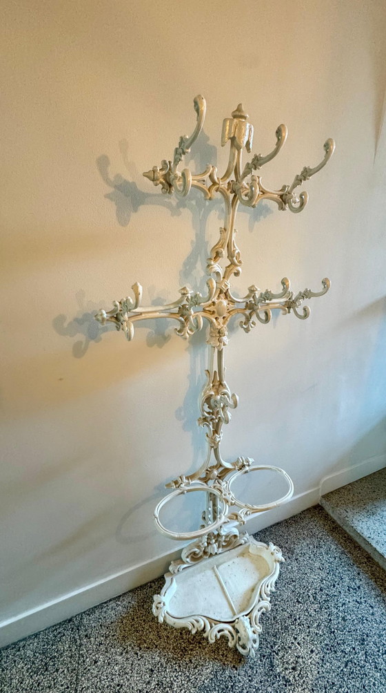 Antieke Victoriaanse kapstok (19e eeuws) Smeedijzer Kleur: gebroken wit - gepatineerd Met plateau en houders voor paraplu's Hoogte 183,5 cm Breedte 79 cm