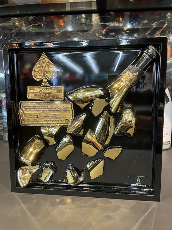 Deze stijlvolle, vierkante creatie (32 x 32 cm) is uitgevoerd in een strakke zwarte lijst en bevat een authentieke Armand de Brignac champagnefles. De gebroken scherven zijn elegant verwerkt in epoxy, wat zorgt voor een speelse en luxueuze uitstraling. Een bijzondere eyecatcher voor liefhebbers van luxe en modern design!