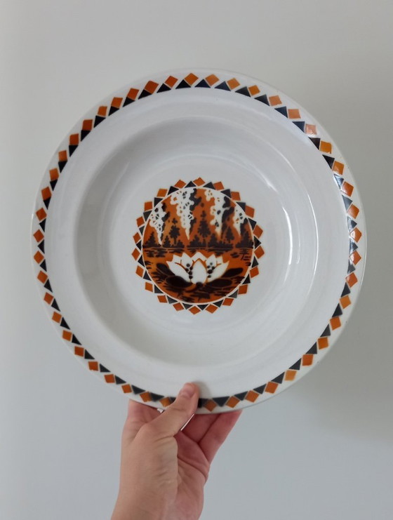 Grote borden voor pasta, salades of soep, gemaakt van zwaar, dik aardewerk uit de Saint-Amand fabriek, gestempeld Hamage & Moulin des Loups (circa 1928), met het ingedrukte "Terre de Fer" merk en het "Nénuphar" patroon met een charmant oranje en zwart Art Deco ontwerp.