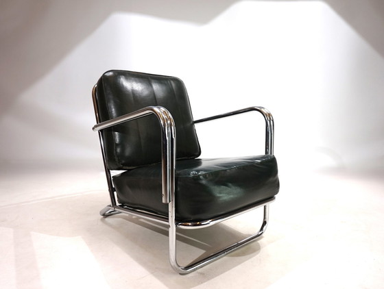 Een klassieke stalen buisfauteuil in de Art Deco stijl van de jaren 1930. De fauteuil heeft een donkergroene hoes van imitatieleer en een frame van chromen buizen die zijn verdubbeld ter hoogte van de armleuningen. Het zitkussen heeft lichte gebruikssporen op de zitting maar biedt goed zitcomfort. Het is verstevigd met een leren bevestiging op een van de achterste hoeken om het te beschermen tegen het metalen frame. Het rugkussen is in zeer goede staat. Het chromen frame vertoont een lichte patina maar heeft een mooie glans. De stoel wordt toegeschreven aan de Amerikaanse ontwerper Gilbert Rhode en de Troy Sunshade fabriek in de VS, die verschillende van deze modellen produceerde. Waarschijnlijk gemaakt in de jaren 1930.