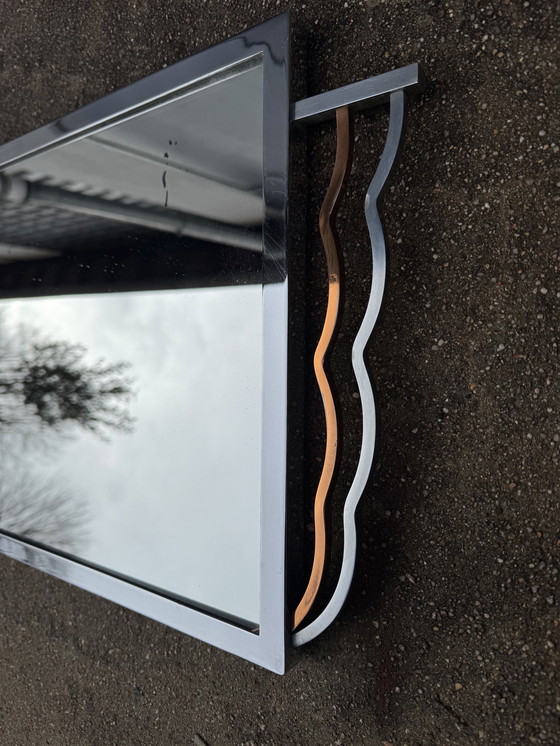 Een charmante, langwerpige landschapsspiegel in art-decostijl, vervaardigd uit verchroomd metaal met zilveren en koperen zijelementen; de achterkant is van gestempeld hout; in zeer goede algehele staat (let op enkele kleine putjes in de spiegel).