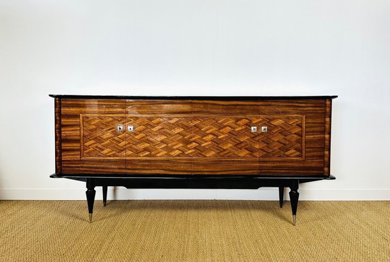 Frans Art Deco dressoir en buffetkast met een prachtige Macassar ebbenhouten nerf en een geometrisch marqueteriemotief in het midden. Een unieke combinatie van Art Deco en mid-century modern design.