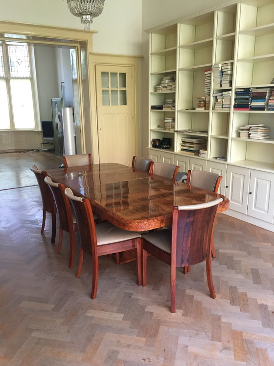 Uit een erfenis verkregen: Een bootpoot tafel van wortelnoten fineer. De originele tafel is vierkant met een uitschuif verlengstuk. In een later stadium is een tweede verlengstuk toegevoegd. Dit is alleen te zien aan het gebruik van multiplex als ondermateriaal voor het fineer. Het patroon van het zichtdeel loopt perfect door. Met het tweede verlengstuk is de tafel 2,40 meter lang. 8 bijpassende stoelen met crème kleurige lederen bekleding. Op de tafel kan geen teken van de maker of fabriek vinden.