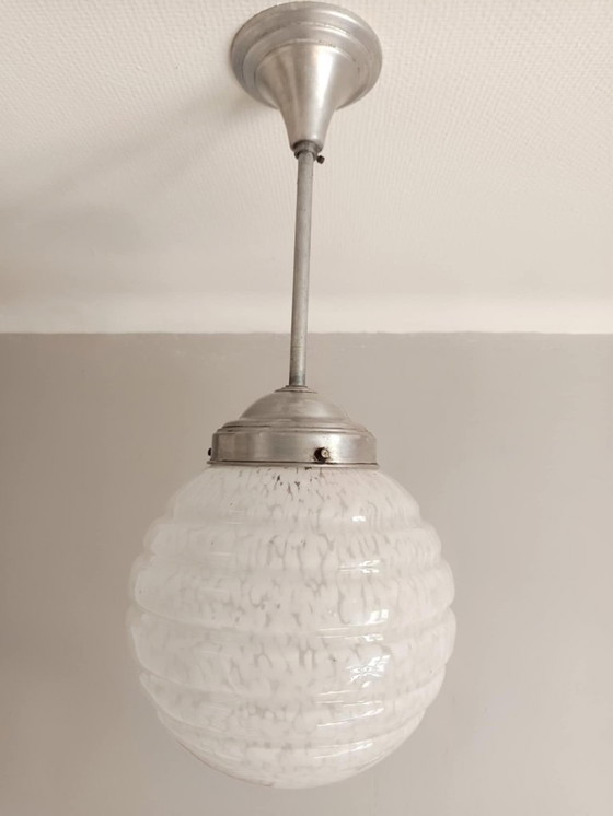 Art Deco hanglamp circa 1940, bestaande uit een ronde bol in lichtblauw Clichy glas met een metalen frame met stijve steel.