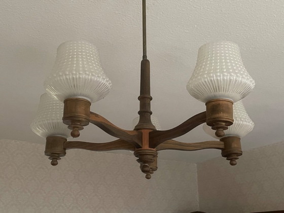 Deze prachtige Art Deco kroonluchter heeft een prachtig bewerkt houten frame en glazen kapjes met structuur. De kroonluchter heeft een krachtige, klassieke vorm en het cacaokleurige hout brengt rust in je kamer. Het glas glinstert heel mooi en poëtisch. Het eikenhout is het trendhout van de meubelbeurs in Mailand, dus je krijgt een mooie combinatie van oud en nieuw. Het ontwerp straalt elegantie en stabiliteit uit. Tegelijkertijd. De kroonluchter is in goede staat, met kleine verkleuringen op het hout die bijdragen aan het karakter en de aantrekkingskracht.