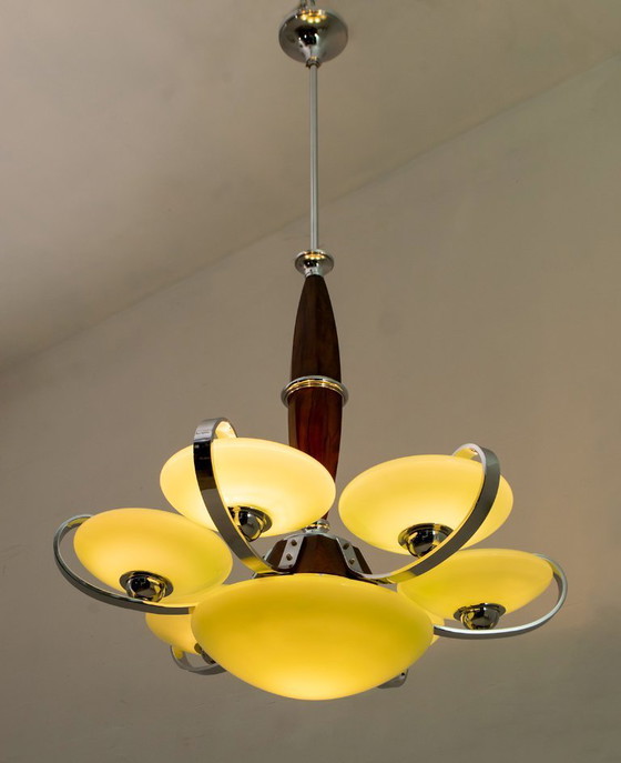 Art Deco kroonluchter gemaakt in Italië in de jaren 1930. De structuur is van verchroomd metaal en hout, de schalen van Murano glas "Incamiciato" met twee lagen glas, wit van binnen en groen van buiten. De kroonluchter is gerestaureerd en gepolijst.