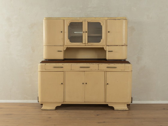 Prachtige tweedelige Art Deco keukenkast uit de jaren 20. Hoogwaardige kast van meubelplaat met acht deuren, twee glazen deuren, zes legplanken, drie lades en tijdstypische poten. Ontworpen en geproduceerd in Duitsland.