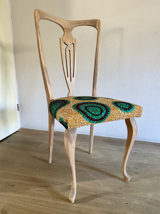 Deze unieke bijzetstoel combineert prachtig Art Deco design met levendige bekleding met Afrikaanse print. Het houten frame heeft elegante rondingen en ingewikkelde uitgesneden details. Het houtwerk is volledig gestript, glad geschuurd en afgewerkt met Osmo hardwax. Natuurlijke kleurverschillen en lichte vergrijzing in het hout (zie foto's) geven een mooi, stoer effect. De zitting is versierd met een kleurrijk textielpatroon in oker, groenblauw en kastanjebruin. Goede kwaliteit katoenen stof.