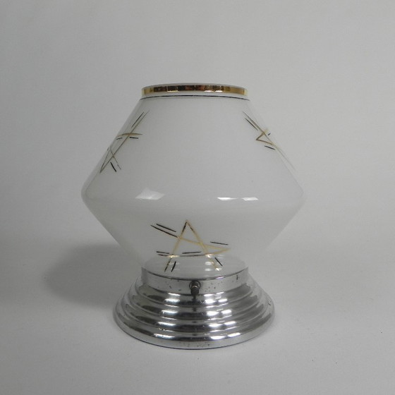 Hoogte Totaal: 22 cm. Ø Glazen Kap: 21 cm. Hoogte Glazen Kap: 16,5 cm. De Lamp Is Voorzien Van Nieuwe Draad En Een Grote Fitting (E27). Herkomst: Frankrijk, Jaren '30. Materiaal: Aluminium, Glas. Al Onze Lampen Zijn Geschikt Voor Led Lampen.