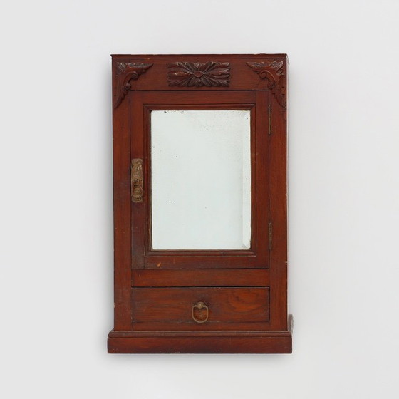 Franse Art Deco wandkast van hout met een afgeschuinde spiegeldeur en een lade eronder. Deze scheerkast heeft erg mooie koperen handgrepen en prachtig snijwerk van bloemen op de voorkant. Als de deur opengaat, zie je één legplank en een contrasterende donkerblauwe binnenkant. Het scheer- of medicijnkastje heeft enkele niet storende kleine gebruikssporen en er ontbreekt een klein stukje aan de voorkant (zie foto's).