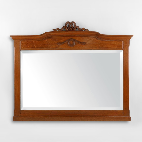 Frankrijk / 1930 / spiegel / eiken / Art Deco / Mid-century Art Deco rechthoekige wandspiegel uit de jaren 1930 vervaardigd in Frankrijk. Deze spiegel heeft een frame van massief eikenhout met snijwerk in art-decostijl en een gesneden strik aan de bovenkant. De natuurlijke afwerking accentueert de warme tinten van het hout en de ingewikkelde detaillering van de lijst laat het vakmanschap zien dat bij de creatie betrokken was.