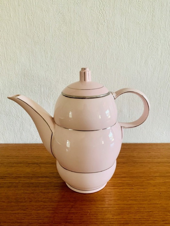 Art deco theepot van RGK, Tsjechoslowakije, jaren 30. Het stuk is gemaakt van porselein met een emaille coating in een prachtige pastelroze tint. Het heeft een elegant design, vorm en decoratie die typerend zijn voor die tijd, met verguld zilveren decoratie op de romp, het handvat, de tuit, de binnenrand, het deksel en de sierknop (zie foto's). De binnenkant onder het deksel heeft aan de ene kant een bolvormig gedeelte dat in de pot past, richting het handvat (zie foto's), en aan de andere kant een bolvormig gedeelte zonder emaille, waardoor er voldoende ruimte is voor een theezeefje (voor losse thee) met een ketting met een haakje aan het uiteinde, dat in een gaatje onder het bovenste deel van het handvat past (zie foto's). De bovenkant van de binnenkant van de pot heeft 11 ruitvormige gaatjes, zodat de gefilterde thee via de tuit kan worden uitgeschonken (zie foto's). De theepot verkeert over het algemeen in zeer goede, originele en vintage staat, met enkele lichte gebruikssporen, tekenen van ouderdom, een lichte verkleuring van het zilverwerk en gebruikssporen die passen bij de leeftijd, evenals een patina op de gehele structuur, romp, handvat, tuit, deksel, rand, knop en voet (zie foto's). Een klein, natuurlijk ontstaan vlekje op de bovenkant van het deksel onder het emaille, geen barst, aangezien het emaille glad is gebleven (zie foto). Lichte gebruikssporen onder de voet (zie foto's). Geen barsten of beschadigingen. Het stuk draagt een groen makersmerk met een kroon erboven, wat aangeeft dat het gemaakt is tussen 1928 en 1938, en een serienummer, "680/5727" (zie foto's). Het is slechts voorzichtig gereinigd met respect voor de originele patina. Alle foto's zijn gemaakt in natuurlijk licht, zowel binnen als buiten, waardoor kleuren kunnen variëren afhankelijk van de helderheid, reflecties, schaduwen, hoek en perspectief. Werkelijke afmetingen: H: 21,5 cm x B: 23,5 cm x D: 13,5 cm. |Materialen: Porselein, Emaille|Kleuren: Roze, Pastel, Zilver | Gedetailleerde staat: Zeer goed — Dit vintage/antieke item heeft geen gebreken, maar kan lichte gebruikssporen vertonen. Lichte slijtage passend bij de leeftijd en het gebruik, Patina passend bij de leeftijd en het gebruik, Oppervlak is gepolijst. |Stijl: Art Deco, Vintage |Land van herkomst: Tsjechië |Fabrikant: Rudolf Kämpf |Het stuk is voorzien van een authenticiteitsmerk.