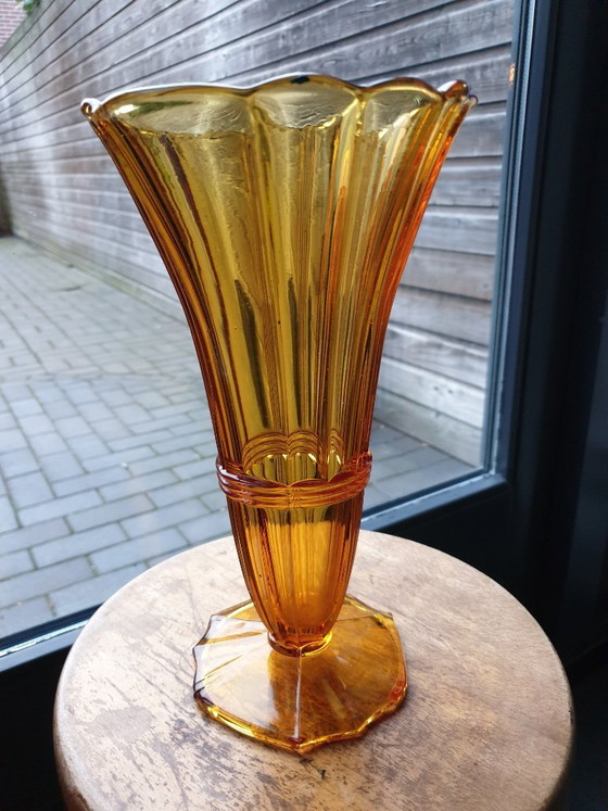Deze prachtige Art Deco vaas voegt een vleugje vintage charme toe aan je interieur. Met zijn warme gele tint en elegante vorm is het een echte blikvanger die perfect past in zowel moderne als klassieke settings.