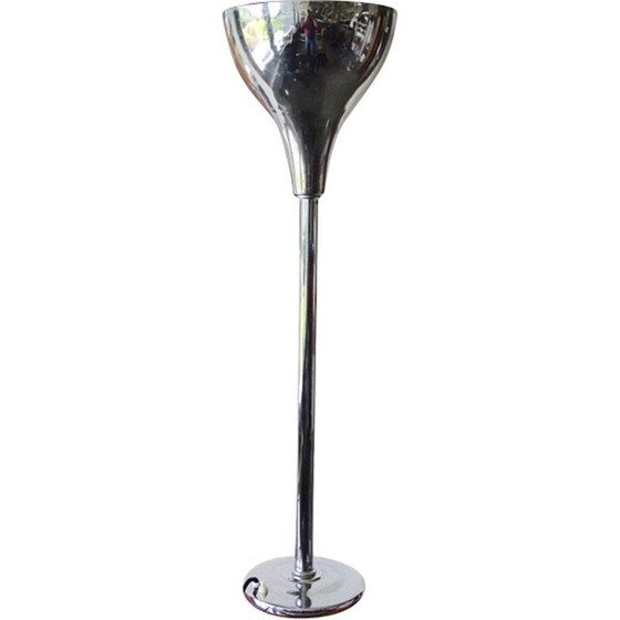 Prachtige woonkamerlamp. Woonkamerlamp van verchroomd metaal met buisvormig vat dat een kegelvormig bekken ondersteunt verzwaarde voet met een lichte fitting uitgerust met een schakelaar goede staat van gebruik