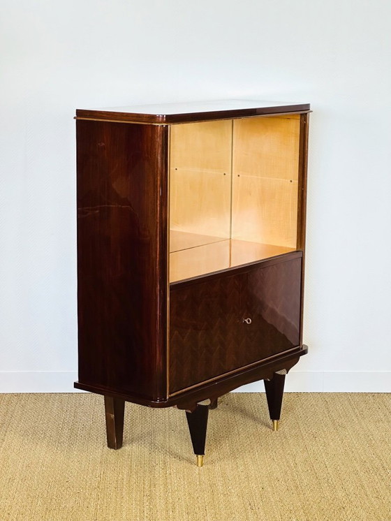 Prachtige vitrinekast uit de jaren 50, in een modernistische of late Art Deco-stijl, waarschijnlijk van Franse of Italiaanse oorsprong.