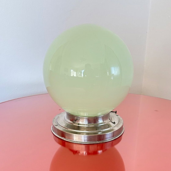 Dit is een prachtige Art Deco plafondlamp met een slanke glazen bol en een stevige metalen voet. Het minimalistische ontwerp en de functionalistische stijl maken het een perfecte aanvulling op elk modern of vintage geïnspireerd interieur. De lamp straalt een zacht, sfeervol licht uit, ideaal voor het creëren van een gezellige sfeer in elke kamer. Het tijdloze ontwerp zorgt ervoor dat de lamp jarenlang een stijlvol stuk blijft.