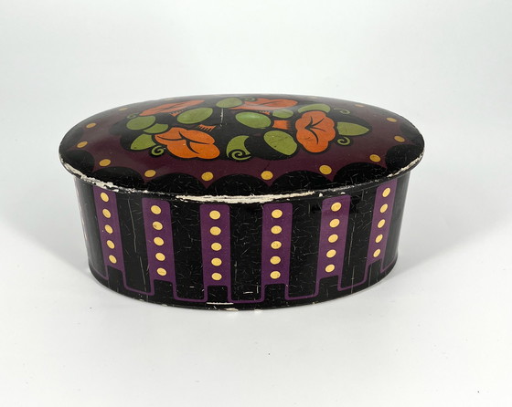 Zeldzame Art Nouveau tinnen doos, waarschijnlijk ontworpen door de beroemde kunstenaar Emanuel Josef Margold aan het begin van de 20e eeuw. Als lid van de Wiener Werkstätte had Margold een beslissende invloed op de esthetiek en stijl van dit kunsthistorische tijdperk. De oude doos is versierd met een decoratief patroon in paars en groen, dat prachtige bloemmotieven laat zien en de karakteristieke kenmerken van Art Nouveau weerspiegelt.