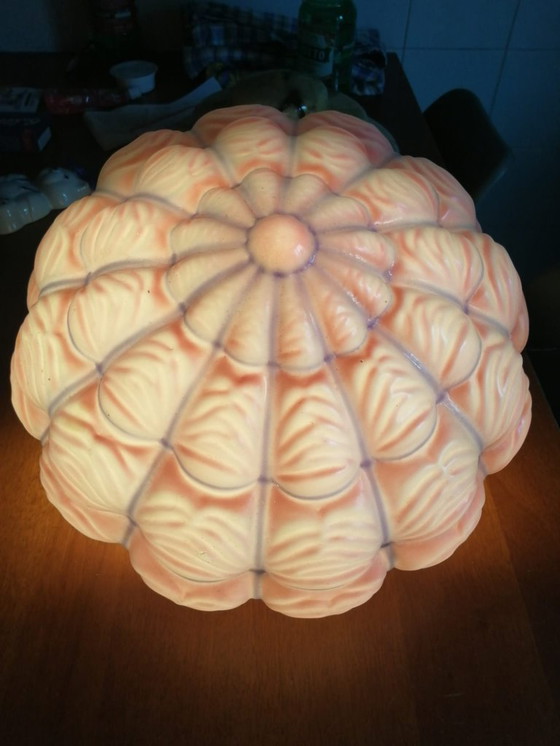 Prachtige sculpturale hanglamp met opaalglas (Murano?) Een Italiaans designstuk dat de essentie van elegantie vastlegt. De grote schelpvorm is voorzien van diepe ribbels die een magnifiek driedimensionaal effect creëren. Wanneer de lamp aan staat, verspreidt het licht zich op een warme en sfeervolle manier. Vervaardigd met de beroemde opaalglastechniek. Het glas is versierd met zachte tinten poederroze en intense accenten van paars/mauve langs de ribbels (typisch voor het artistieke vakmanschap van Murano uit die tijd). Wordt geleverd in een zeer beschermde professionele verpakking. Hoogte ca. 20 cm. Mondstuk 30 cm, maximale diameter ca. 36 cm. Intact en in uitstekende staat. Zorg voor een goede verpakking. Nog steeds met 2 originele snoerhaken (één ontbreekt).