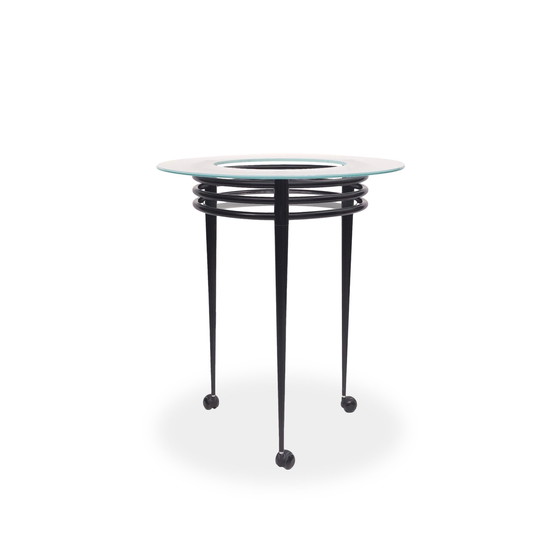 Ontdek de tijdloze charme van deze zeldzame Italiaanse bartafel uit de jaren 1980. Dit uitzonderlijke meubelstuk combineert hoogwaardige materialen en een geraffineerd ontwerp dat klassieke elegantie en moderne functionaliteit perfect combineert. De heldere en gesatineerde glazen bladen geven de tafel een verfijnde uitstraling, terwijl je op het bovenste blad met een elegante ronde uitsparing je beste glazen, flessen of accessoires in stijl kunt uitstallen. Het zwart gelakte metalen frame vormt een harmonieus contrast met de glazen oppervlakken. Voor extra flexibiliteit is de bartafel uitgerust met wielen, zodat je hem moeiteloos kunt verplaatsen naar verschillende locaties. Een echt designhoogtepunt dat niet alleen functioneel is, maar ook een blikvanger. Fabrikant: Artelano (Italië) Model: Luna Atlantique Ontwerp: Pascal Mourgue Details van het item - Glazen blad met ronde uitsparing aan de onderkant gesatineerd - Ingelegd helder glazen blad - Zwart metalen frame op 3 wielen - Het item komt uit een huisdiervrij, niet-rokers huishouden - Houd er rekening mee dat de foto's deel uitmaken van de beschrijving Conditie De bartafel is in uitstekende staat voor zijn leeftijd met slechts normale lichte gebruikssporen zoals minimale krassen - maar zonder chippen of schade (zie foto's). Afmetingen: hoogte 76cm, diameter 65cm