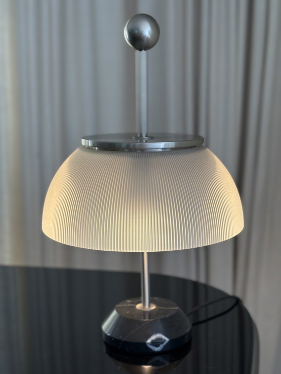 Deze Artemide Alfa Tavolo tafellamp is een moderne klassieker, ontworpen door Sergio Mazza. Hij heeft een strakke metalen structuur met een verfijnde marmeren voet en een glazen kap die een zacht, sfeervol licht uitstraalt. Perfect om een vleugje elegantie toe te voegen aan elke kamer, combineert deze lamp functionaliteit met stijlvol design. Ideaal voor moderne interieurs, valt hij op door zijn unieke vorm en hoogwaardige materialen.