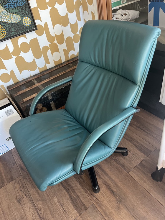 Artifort draaifauteuil met een 5 poot en armleuningen ontworpen door Geoffrey Harcourt en geproduceerd door Artifort. Groen leer, onderstel lak zwart en hij zit heerlijk. HxBxD= 96cm x 68cm x 68cm, zithoogte 42cm Ziet er smetteloos uit zie foto’s