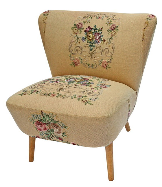 Het klassiek binnenwerk van deze Artifort is volledig gerestaureerd en opnieuw gestoffeerd met fijn borduurwerk op beige stramien. Ook bijbehorende half ronde vintage hocker poef is volledig gerestaureerd