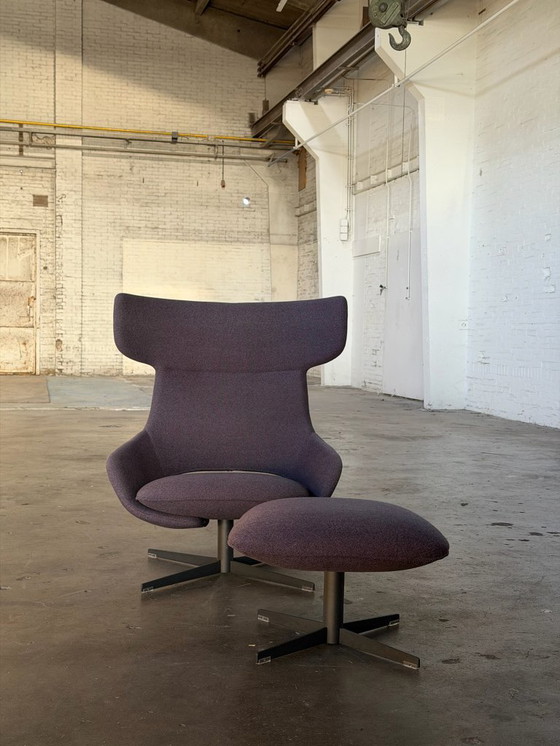 Deze Artifort Kalm draaibare lounge fauteuil met bijpassende poef verkeert in absolute nieuwstaat en is uitgevoerd in de originele Kvadrat stof. De stof heeft een fijne, gelijkmatige weving en een rustige grijspaarsachtige tint die per lichtinval subtiel verandert. Het zitcomfort is prettig ondersteunend en ideaal om ontspannen in te loungen, mede dankzij de ergonomische vorm en de comfortabele poef. De fauteuil is perfect onderhouden, zonder zichtbare gebruikssporen, en straalt tijdloos en luxe design uit.