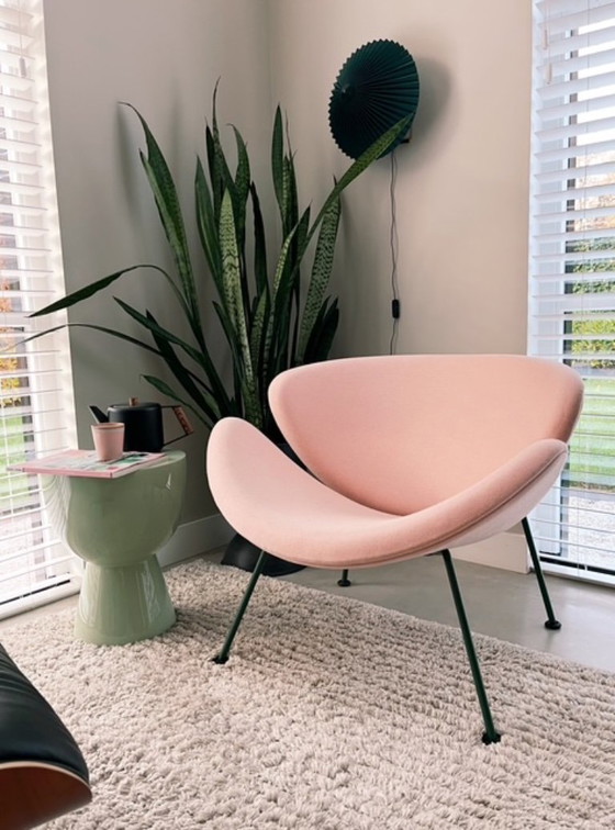 Breng een vleugje iconisch design in je huis met de Artifort Orange Slice, een meesterwerk van Pierre Paulin uit 1960. Deze fauteuil, met zijn zachte roze bekleding en elegante groene metalen poten, is een perfecte mix van comfort en stijl.