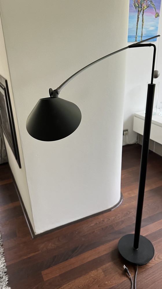 Dit is een strakke en moderne Artimede Milano Nestore vloerlamp in zwart, ontworpen door Carlo Forcolini. De lamp heeft een minimalistisch ontwerp met een stevige metalen constructie, perfect voor eigentijdse interieurs. De lamp biedt uitstekende verlichting en is verstelbaar naar wens. Ideaal voor woonkamers of leeshoeken.