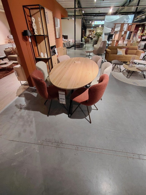 De ovale Arvada eetkamertafel van Xooon heeft een afmeting van 220x110cm. De hoogte is 77cm. Het blad is uitgevoerd in gelakt massief eikenhout. Het onderstel in zwart metaal.
