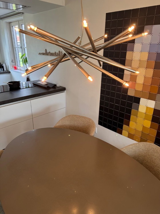 De lamp bestaat uit een netwerk van roestvrijstalen buizen met lichtpunten aan de uiteinden. Dit iconische ontwerp zorgt voor een unieke lichtverspreiding en maakt de lamp tot een echte eyecatcher in elk interieur.