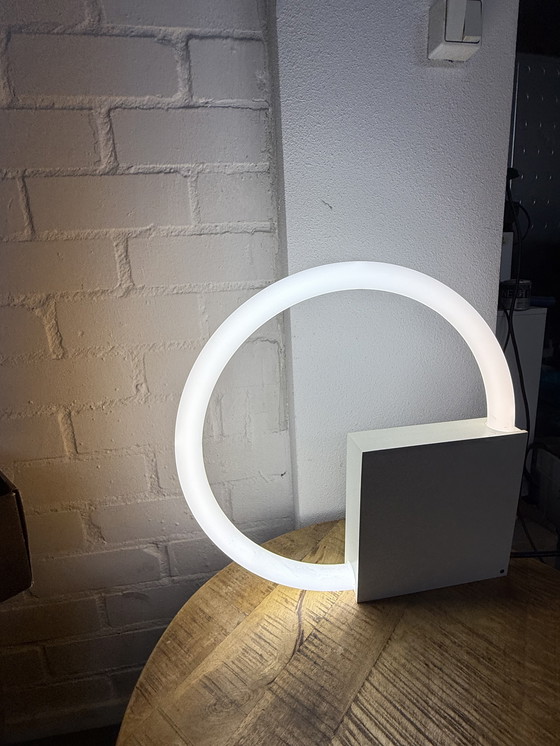 Dit is een prachtige ATELIER ARTIFORTE TC-6 tafellamp ontworpen door Aldo van den Nieuwelaar. De lamp heeft een modern, minimalistisch ontwerp met een cirkelvormig lichtelement en een slanke metalen voet. De lamp straalt een zachte, sfeervolle gloed uit, perfect voor het creëren van een gezellige sfeer in elke kamer. Het unieke ontwerp maakt het een opvallend stuk voor elk modern interieur.