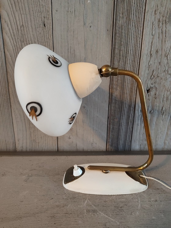 Deze Atomic Space lamp is een prachtig voorbeeld van Space Age design, perfect voor liefhebbers van retro en futuristische stijlen. De lamp combineert een elegante witte glazen kap met een goudkleurige metalen arm, wat een verfijnde uitstraling geeft aan elke ruimte.