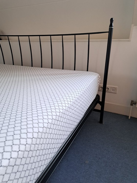 Leuk spijlen bed van Auping met mooie ronde vorm hoofdeind en voeteneind. Kleur is donker blauw metallic. Het bed ziet er nog goed uit. Er zijn 2 kleine lakbeschadigingen maar dit valt niet op.