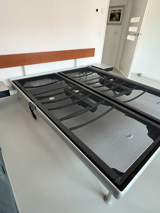 Mooi aluminium Auping match bed met twee nachtkastjes (40x40) met lade (blauw front) en kersenhouten achterwand. Het bed heeft twee eenpersoons (90x220) elektrisch verstelbare spiraalbodems . Hoogte bed 35 cm, hoogte achterwand 70 cm. Bed is in goede staat. Van een van de elektrische bedieningen is isolatie niet meer helemaal intact (zie foto). Zonder matrassen. Begin februari beschikbaar.