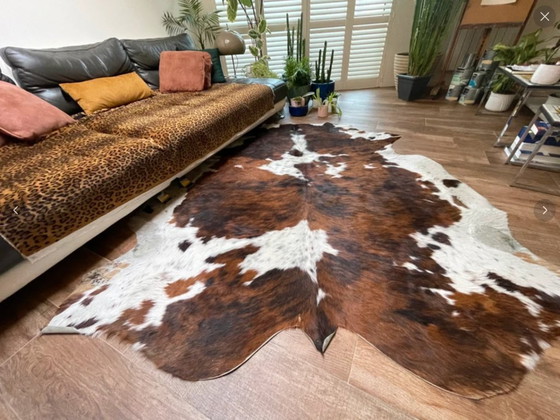 Prachtig driekleurig koeienhuid vloerkleed met een warme, natuurlijke uitstraling.