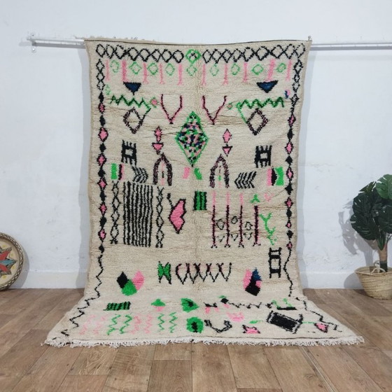 Prachtig authentiek Marokkaans Azilal-tapijt, handgeweven van natuurlijke wol en versierd met een expressieve compositie van Berbersymbolen in zwart, roze, groen en een vleugje blauw op een zachte ivoorkleurige achtergrond.
