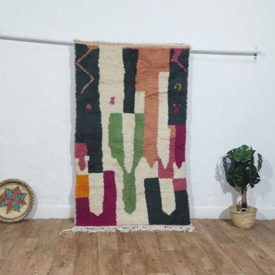 Prachtig authentiek Marokkaans Berber tapijt, handgeweven van natuurlijke wol en gekenmerkt door een sterke abstracte compositie en artistiek karakter.