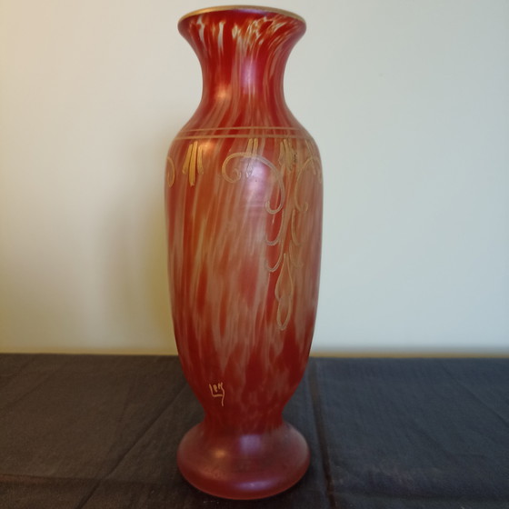 Prachtige, originele Art Nouveau vaas van de beroemde Franse glasmeester François-Théodore Legras (Saint-Denis). Dit exemplaar is uitgevoerd in een sfeervolle rood-oranje marmer-optiek ("verre émaillé"), typerend voor de vroege 20e eeuw.