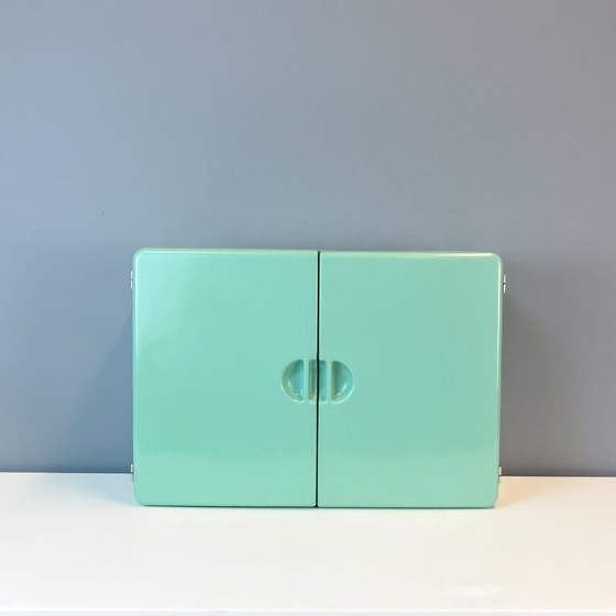 Een echte blikvanger voor uw badkamer – Italiaans design uit het Space Age-tijdperk in een zeldzame mintgroene kleur. Met afmetingen van 51 x 36 cm past dit kastje bijna overal en biedt het toch voldoende ruimte voor uw medicijnkastje of make-up.