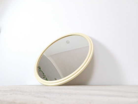 De spiegel heeft een beige kunststof frame. Gemakkelijk aan de muur te bevestigen met één schroef per oor.