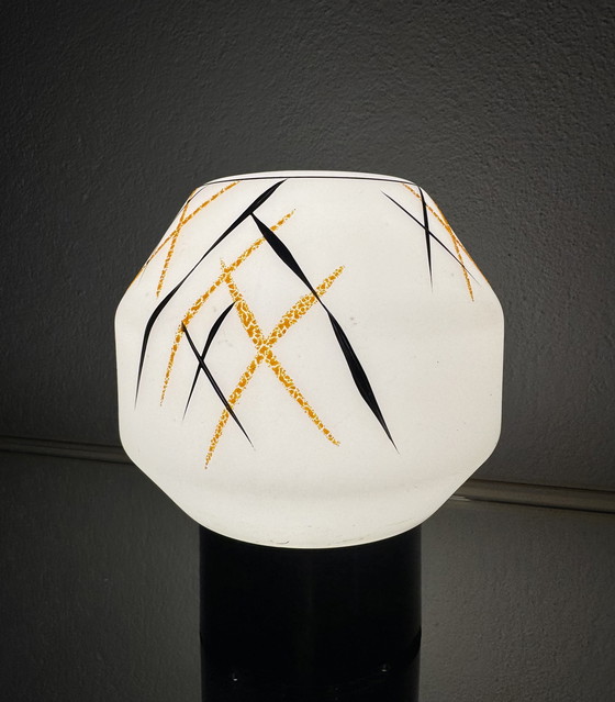 Mooie kleine tafel- of plafondlamp uit de jaren 60 in mat wit opaline met gekleurde emaille decoratie op een zwarte bakelieten voet; zeer goede staat, voor bajonetlamp.