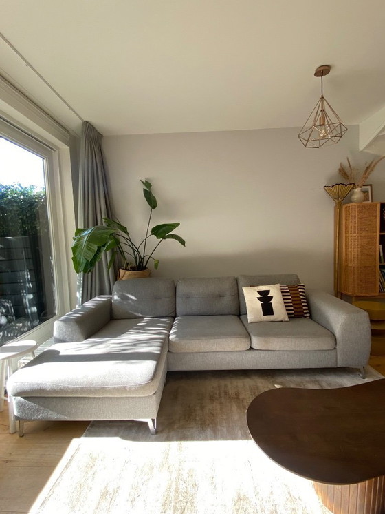Comfortabele, ruime en stijlvolle driezitsbank met longchair, gekocht bij Eijerkamp (van Xooon). Uniek is dat de ‘hoek’ (chaise longue) verwisselbaar is; het longchair kussen is omkeerbaar en het onderstel aan beide kanten te monteren. Overal te plaatsen dus ongeacht wat de indeling in je ruimte wordt! In de hoek kun je met z’n tweeën relaxed zitten. Genoeg ruimte voor 3 tot 5 mensen dus.