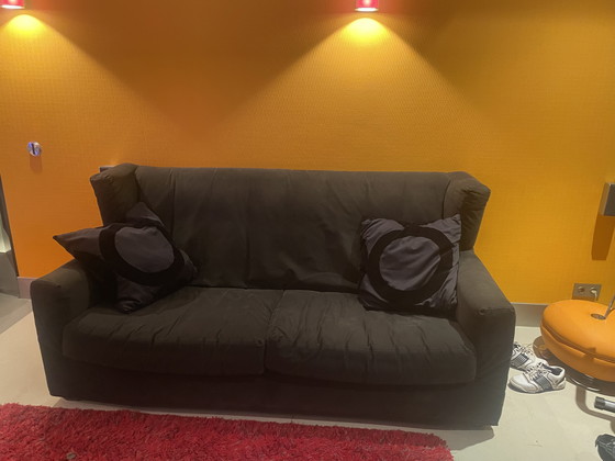 Bank in zwarte stof , ontworpen door Maroeska Metz voor het label”ARX” van meubelfabriek Gelderland, dus geheel beuken romp en niet te verslijten en dus zwaar gewicht.