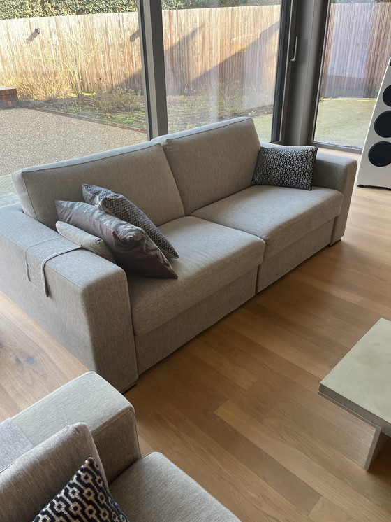 Heel mooie stevige slaap lounge bank van het mooie Italiaanse merk Pol74. Het is een 2 1/2 zits. 7 jaar geleden gekocht. Mooi systeem waarbij je hem als bank en als lounge bank kan gebruiken. Uitgetrokken is de afmeting 148 cm diep.