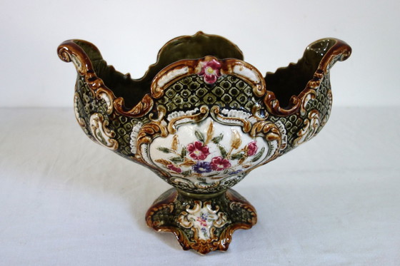 Een vroeg 20ste-eeuwse Art Nouveau bloempotvaas of pothouder van keramiek. Handgeschilderd polychroom barbotine bloemmotief. Gemerkt 478, oude stempel uitgewist. In perfecte staat, geen chips of inkepingen.