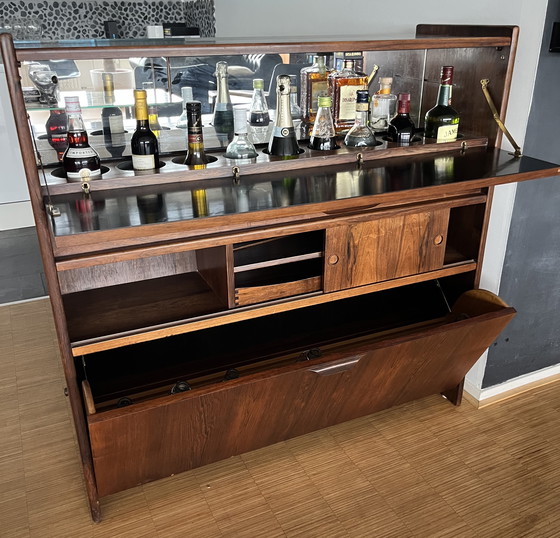 Deze prachtige vintage barkast, ontworpen door Johannes Andersen voor Skaaning & Søn, is een toonbeeld van Deens vakmanschap uit de jaren '60. Gemaakt van palissanderhout, biedt deze kast niet alleen een stijlvolle uitstraling maar ook functionaliteit. De kast beschikt over een koperen voetsteun en een bovenkant die kan worden geopend voor het serveren van drankjes. Binnenin vind je diverse vakken voor glazen en flessen, evenals een toonbank voor het bereiden van drankjes. De spiegel en flessenhouders voegen een extra vleugje elegantie toe. Perfect voor het ontvangen van gasten in stijl.