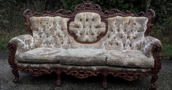 Stap binnen in een wereld van weelde met deze prachtige barokke sofa, een waar testament aan de grandeur van een vervlogen tijdperk. De ingewikkelde houtsnijwerken en de pluche bekleding nodigen u uit om te genieten van luxe en elegantie.